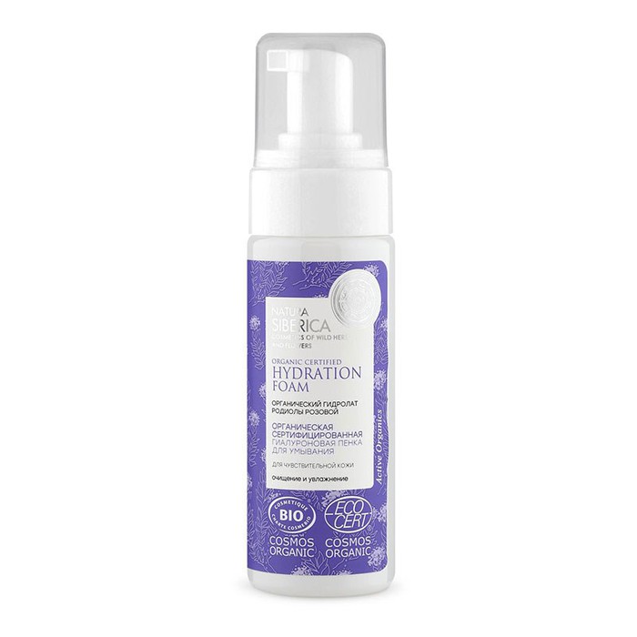 Органическая сертифицированная гиалуроновая пенка для умывания для чувствительной кожи нежно очищает, устраняя загрязнения и макияж.