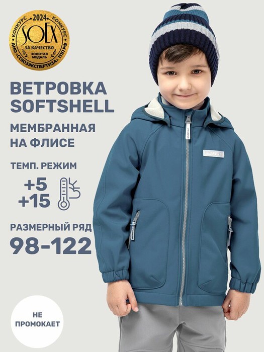 Ветровка для мальчика СОФТ из Softshell идеально подходит активным детям на прогулках, которые много двигаются и не сидят на месте. Softshell это инновационный материал нового поколения, внешний слой которого защищает от влаги и ветра, внутренний слой из флиса сохраняет тепло и отводит лишнюю влагу, а промежуточный мембранный слой имеет хорошую паропроницаемость и позволяет коже дышать. Softshell приятный на ощупь, легкий и эластичный материал, не сковывающий движения ребенка.Функционал: - центральная застежка и карманы на молнии, - ветрозащитная планка, - съемный капюшон на кнопках. Мы все продумали до мелочей, поэтому модель оснащена манжетами на резинке для защиты от проникновения холодного ветра.Когда носить? Весной и осенью с теплой поддевой, а также прохладным летом в качестве ветровки на футболку.Температурный режим от +5°С до +15°С.Уход за изделиями из Softshell аналогичен уходу за изделиями из мембранной ткани и достаточно прост — большинство загрязнений легко удаляются влажной салфеткой или щеткой с водой. Возможна машинная стирка при 30°С с использованием жидких средств для мембранной ткани. Отжим на минимальных оборотах, сушка на вешалке в расправленном виде.