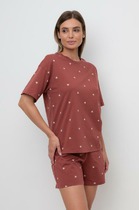 Сорочка женская из трикотажного полотна «кашкорсе» с набивным рисунком, слегка расширенная книзу, с короткими втачными рукавами, углубленной формой горловины. Низ изделия и нижние срезы рукавов обработаны эластичной тесьмой с фасонным краем.