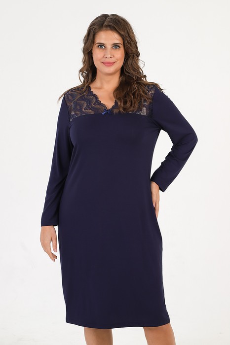 Сорочка женская из гладкокрашеного трикотажного вискозного полотна, прямого силуэта, с длинными втачными рукавами и горловиной V-образной формы. Перед с притачной кружевной кокеткой и декоративным бантиком из узкой атласной ленты в центре соединительного шва.