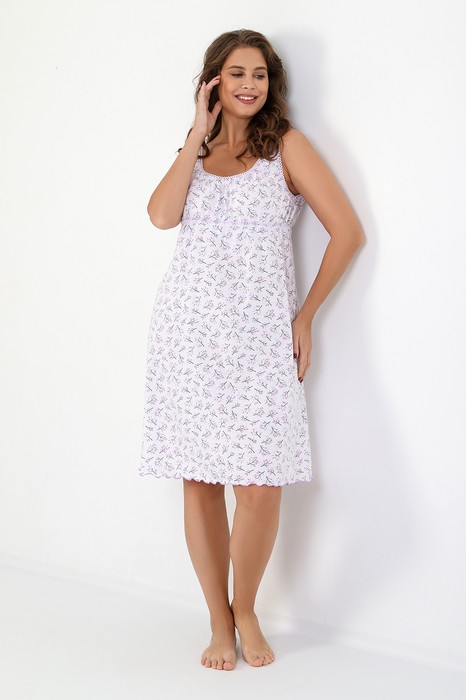 Сорочка женская из трикотажного полотна «кулирка» с набивным рисунком, расширенная книзу, без рукавов, с расширенной, углубленной горловиной овальной формы и притачной кокеткой по переду. Срезы пройм и горловины, а также шов притачивания кокетки, обработаны фасонной эластичной тесьмой с кружевным краем. Низ изделия обработан узкой обметочной строчкой.