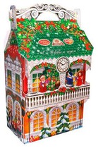 Яркий картонный домик, полный разнообразных сладостей. Увесистый, красивый подарок для самых разборчивых сластен, дизайн, который настраивает на волну уюта и ожидания праздника.