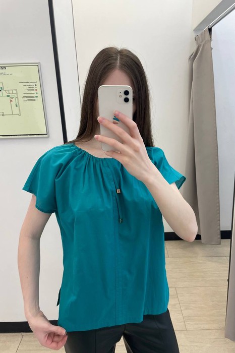 Блуза свободного силуэта из хлопковой ткани. Низ изделия с разрезами по бокам. Цельнокроеный короткий рукав. По центру передней части изделия выполнен шов с декоративной отстрочкой. По горловине сборка на изящные завязки с металлическими наконечниками.