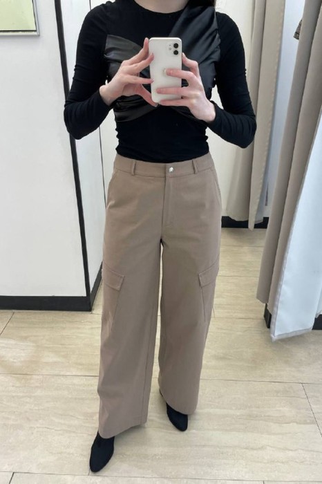 Брюки-карго прямого силуэта из эластичного денима. На задней части брюк отрезная кокетка и накладные карманы, на передней - карманы с подкройным бочком. По боковым швам выполнены накладные карманы с клапанами. Притачной пояс со шлёвками. Застёжка на молнию-гульфик и кнопку.