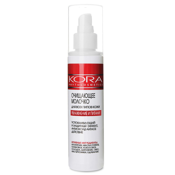 Нежное очищающее молочко от KORA предназначено для бережного снятия декоративной косметики и уличных загрязнений с лица и шеи и для подготовки кожи к дальнейшим уходовым процедурам.Благодаря обилию природных компонентов, входящих в его состав, оно также хорошо подходит для снятия макияжа с чувствительной области глаз.Такое очищающее молочко подходит для всех типов кожи, в том числе для молодой и возрастной, поскольку оно не содержит никаких агрессивных ингредиентов, способных пересушить лицо и нарушить природный защитный слой. Умывание с его помощью проходит легко и комфортно.Кроме того, высокое содержание аллантоина наделяет это мягкое очищающее молочко уходовыми качествами — оно глубоко увлажняет кожу, смягчает ее, успокаивает и препятствует появлению шелушений и раздражений. А натуральные растительные масла и экстракты растений обогащают лицо витаминами, ценными микро- и макроэлементами, дополнительной влагой, а также усиливают природные защитные функции кожи и придают ей эластичность и бархатистость.Активные ингредиенты: Аллантоин, натуральные соевое, оливковое и кокосовое масла, солодка, шиповник, овес, лист брусники, одуванчик.Применение: Лицо и шею слегка намочить водой, затем несколько раз нажать на дозатор и полученную порцию средства распределить по коже, совершая аккуратные круговые движения по массажным линиям. Затем смыть молочко с помощью проточной воды. При необходимости повторить процедуру, уделяя особое внимание участкам с наибольшим количеством косметики. Завершить уход тоником и ночным кремом, соответствующими типу кожи.
