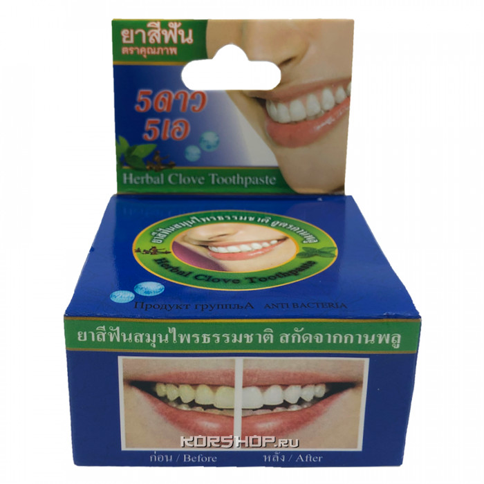 Отбеливающая травяная зубная паста с гвоздикой от торговой марки 5 Star имеет прекрасный натуральный состав. Это средство поможет добиться голливудской улыбки и предотвратить развитие кариеса, парадонтоза, парадонтита и других заболеваний десен и зубов. Расходуется чрезвычайно экономично, и для одного использования достаточно лишь небольшой горошины пасты. Купить отбеливающую травяную зубную пасту с гвоздикой 5 Star с доставкой на дом по Москве и Подмосковью можно в интернет-магазине KorShop.ru.