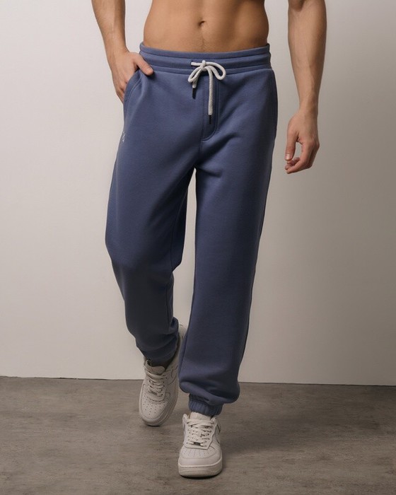 Мужские брюки, джоггеры с резинкой по низу брюк. Пояс из 2-х деталей, внутри резинка. По поясу отстрочка, петли,шнур. Боковые карманы с двойной отстрочкой, боковые швы отстрочены. Задний карман на правой задней половинке брюк.