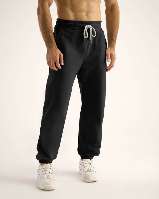 Мужские брюки, джоггеры с резинкой по низу брюк. Пояс из основной ткани, внутри резинка,со шнурком. По поясу отстрочка, петли. Боковые карманы, боковые швы отстрочены.
