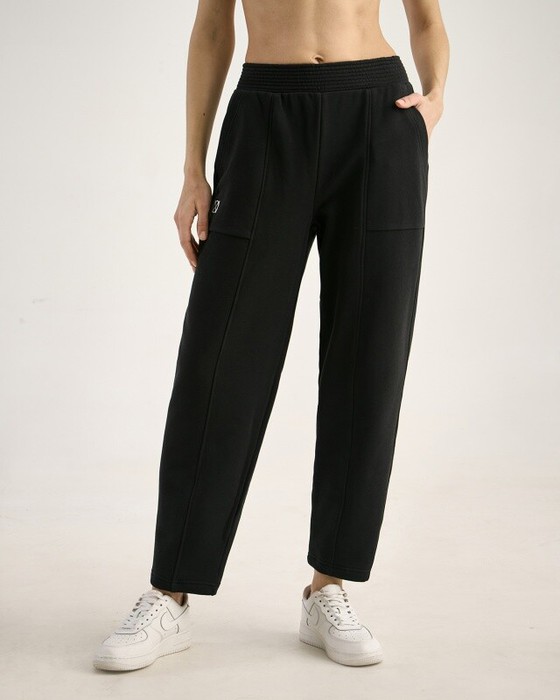 Брюки-бананы. Передние половинки брюк со швом. Накладные карманы по передним боковым половинкам брюк,между швами. Пояс из основной ткани, отстрочен.