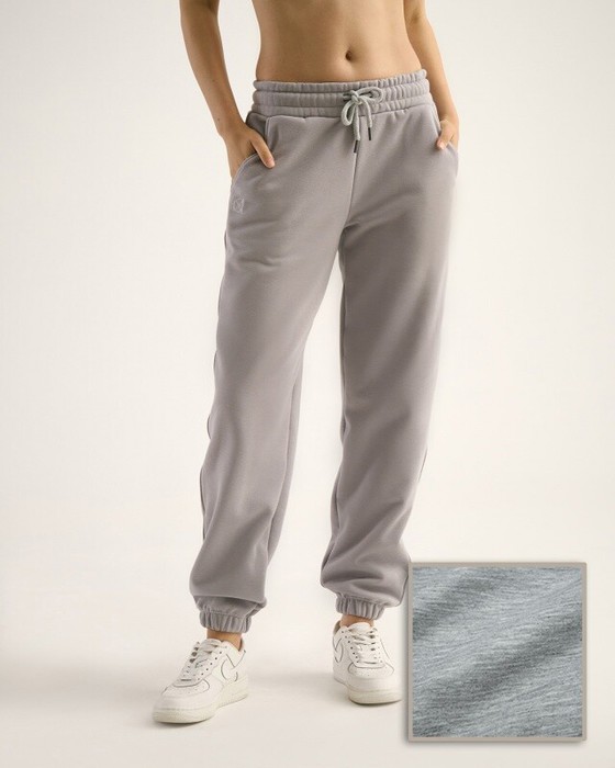 Джоггеры свободного кроя с боковыми карманами, собранные внизу. Широкий эластичный пояс со шнуром.
