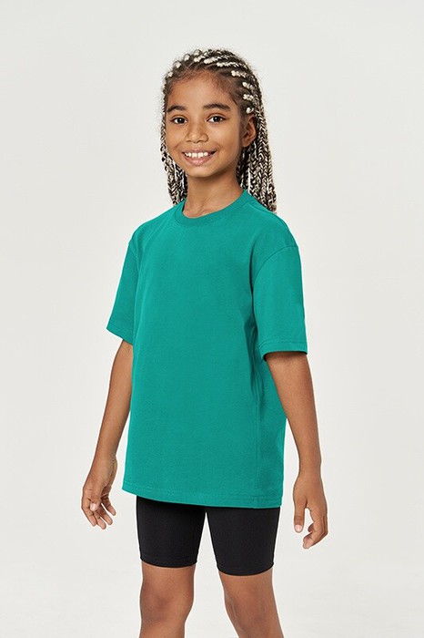 Футболка унисекс детская. Спущенное плечо, втачной рукав. Укрепление горловины спинки контрастной бейкой.