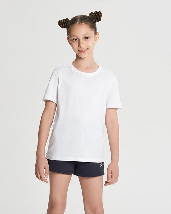 Футболка унисекс детская. Спущенное плечо. Втачной рукав. Укрепление горловины спинки и плечевых швов бейкой из основной ткани.