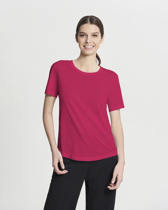 Женская футболка полуприлегающего силуэта с фигурным низом. Горловина окантована.