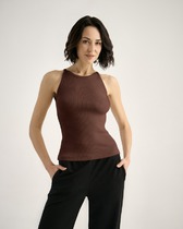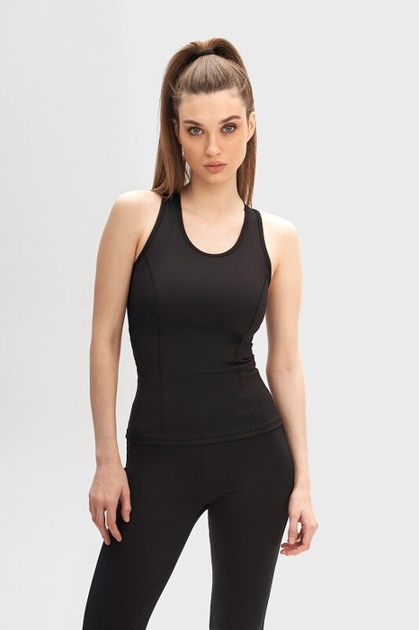 Майка спортивная, отрезная под грудью. По деталям полочки и спинки рельефные швы. Лиф полочки двойной. Горловина и проймы окантованы.