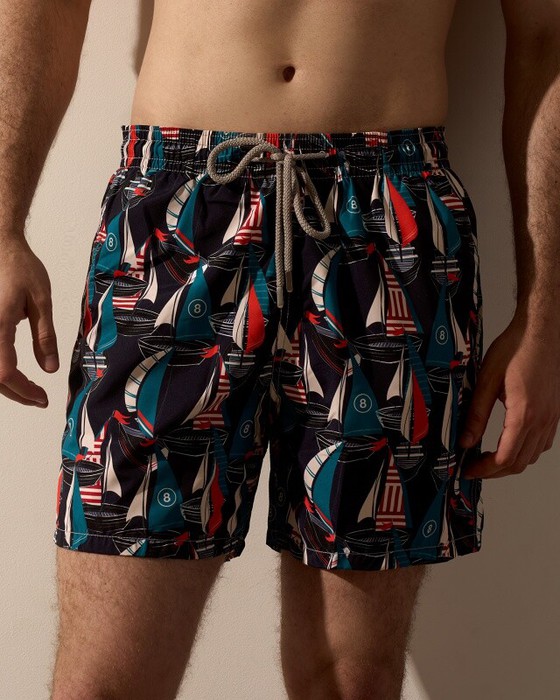 Плавательные шорты. Карманы в боковых швах. Задний карман с клапаном на правой задней половинке шорт. Пояс цельнокроенный, отстроченный, внутри с резинкой и шнурком.