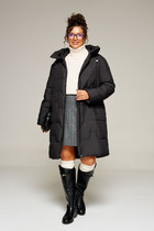 Утепленное пальто от бренда D'imma fashion studio, выполненное из гладкого матового материала со вставками из эко-кожи, на шелковистой подкладке с именным логотипом бренда. Для утепления использован наполнитель термМакс, рассчитанный на температуру до -30 градусов. Пальто полуприлегающего силуэта, с капюшоном с отделкой из искусственного меха, спереди застегивается на скрытую молнию и пуговицы на петлях, по бокам карманы на молнии.