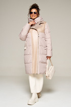 Женственное и элегантное утепленное пальто из комбинированной ткани. Полуприлегающий силуэт создан рельефами из горловины на передней части и спинке. Центральная застежка на молнию, закрытую планкой с кнопками. Карманы в рельефном шве на потайных молниях. Воротник-стойка. Рукав втачной двухшовный, длина 64 см, низ рукава можно загибать, регулируя длину. Длина изделия по спинке 85 см. Утеплитель холкон (см.описание), плотность 200, в рукавах 150.