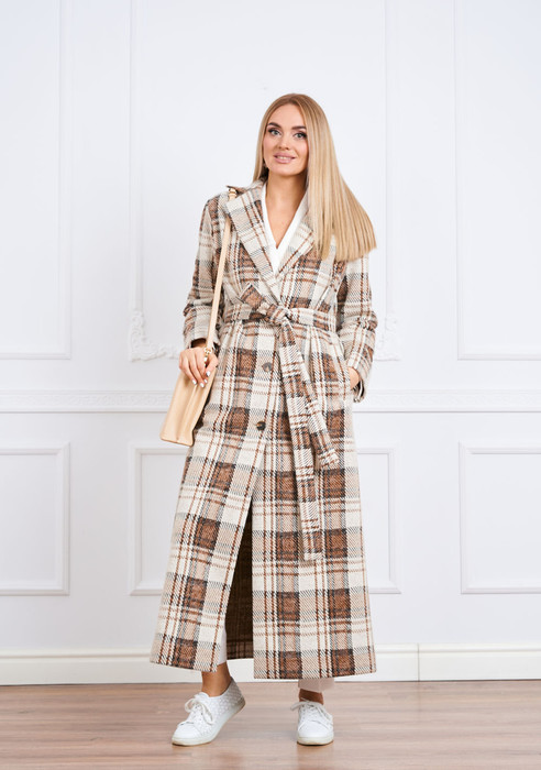 Пальто женское демисезонное под пояс из той же ткани, прямого силуэта, удлиненное, воротник отложной с лацканами, рукав втачной на спущенной пройме, застежка центральная на петли и пуговицы, по переду-прорезные карманы с листочками, по спинке в среднем шве шлица, изделие без подкладки.