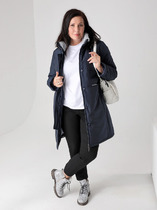 Утепленный плащ прямого силуэта с легким заужением книзу. Застежка - на двухзамковую молнию, что позволяет при необходимости регулировать комфортность шага. Воротник - стойка, переходящая в капюшон. Две пары функциональных карманов: нижние  застегиваются на молнию, верхние - на кнопку. Есть внутренний кармашек  на молнии. Длину втачного рукава можно регулировать за счет отворота. Контрастная внутренняя отделка и фурнитура освежают и зрительно вытягивают силуэт демисезонного пальто.  Плащевая ткань имеет водоотталкивающую пропитку,  которая выдержит небольшой  дождь, снег и ветер. Хорошо зарекомендовавший себя утеплитель "Холлофайбер", плотностью 100гр/м, защитит от весенней прохлады.  Подкладка в изделии выполнена из ткани в мелкую полоску.  Утепленный плащ такой длины хорошо сочетается как с брюками, так и с юбкой или платьем, а с помощью обуви и аксессуаров Вы можете менять свой стиль.