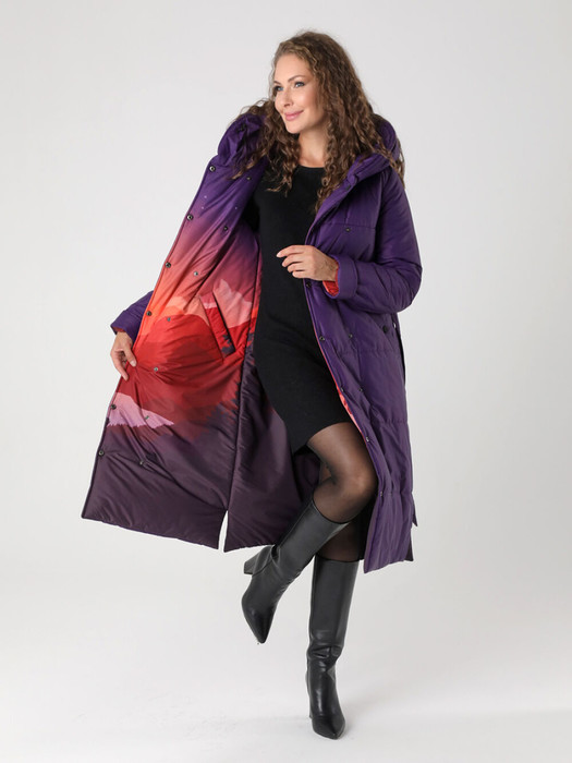 Стильное двухстороннее пальто на кнопках прямого силуэта, с капюшоном и ярким акцентным принтом украсит гардероб девушек и женщин разных возрастных категорий.  Прямой силуэт пальто можно скорректировать с помощью съемного завязывающегося пояса, акцентируя линию талии и создавая тем самым большее прилегание. Длина втачного рукава регулируется отворотом. На обеих сторонах пальто есть функциональные карманы. Плащевая ткань, из которой выполнено пальто, имеет водоотталкивающую пропитку, выдерживающую небольшой  дождь или снег. Хорошо зарекомендовавший себя  современный утеплитель с содержанием овечьей шерсти "Альполюкс", плотностью 300 г/м, защитит от холода и ветра. Сочетание в этом модном зимнем пуховике сдержанности и яркости поможет в создании различных образов!  Выбирайте понравившееся цвет, меняйте аксессуары и обувь, и это пальто станет любимой вещью в Вашем гардеробе! Пусть зима  будет не только комфортной, но и стильной!