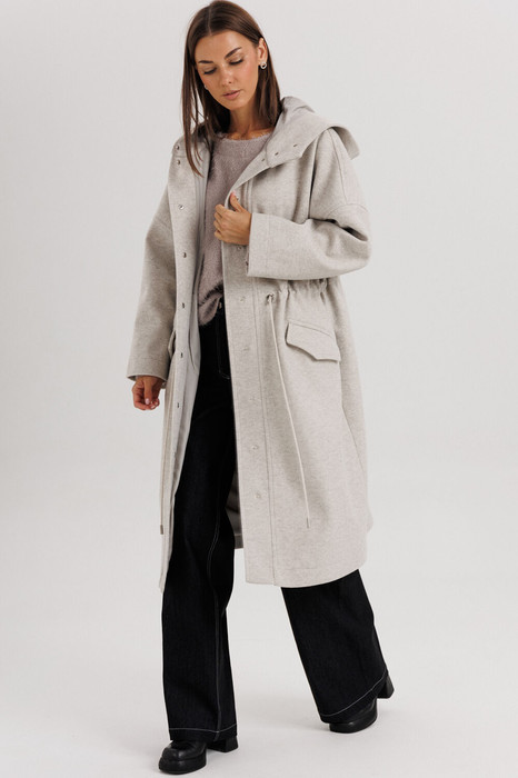 Женское пальто с капюшоном — стильная и практичная модель для прохладного сезона. Его удлинённый силуэт и мягкий оттенок создают элегантный образ, а удобный капюшон и регулируемая талия обеспечивают комфорт в любую погоду.