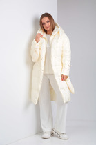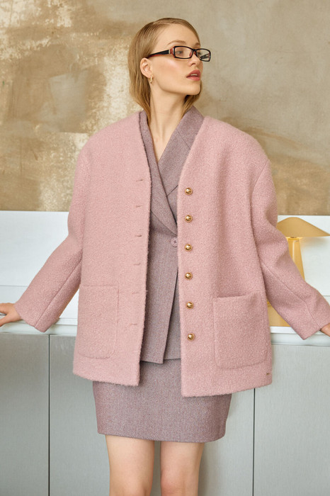Полупальто свободного кроя, прямого силуэта на подкладке. Линия плеча спущена. Рукав длинный, по шлице рукава пришит ряд металлических пуговиц. Y-образный вырез горловины. Застежка на петли и пуговицы. По переду накладные карманы.