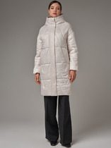 Пальто женское, прямого силуэта, со спущенной плечевой линией. По переду с накладными карманами с клапанами, которые застёгиваются на петлю и пуговицу, с центральной застёжкой на тесьму молнию. Рукав втачной, длинный, с отложной манжетой. По горловине капюшон с кулисой и декоративной тесьмой. В боковых швах разрезы с тесьмой молнией.