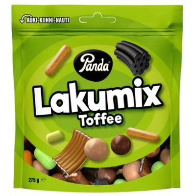 Панда ЛакуМикс Тоффи 275г Ингредиенты: Сахар, патока, МУКА ПШЕНИЧНАЯ, патока, патока крахмальная, какао-масло, растительные масла (полностью отвержденные (кокосовое, рапсовое), кокосовое), МОЛОКО МОЛОКО МОЛОКО МОЛОКО ОБЕЗЖЕННОЕ СУХОЕ, экстракт лакрицы, крахмал рисовый, крахмал кукурузный, какао тертое, МОЛОКО ЦЕЛЬНОЕ, ЦЕЛЬНОЕ МОЛОКО, (Е414), красители (Е153, Е160а, Е100, Е162, Е141), средства для обработки поверхности (масла растительные (кокосовое, рапсовое), Е903, Е901, Е904), хлорид аммония, эмульгатор (лецитин), соль, регулятор кислотности (Е330). Соотношение смешивания сладостей может варьироваться. Аллергены: Содержат пшеничное молоко, злаки и продукты, содержащие глютен. Пищевая ценность на 100 г энергии 1616 кДж / 382 ккал Жир 6,9 г из них 5,1 г насыщенных Углеводы 75 г в том числе сахара 54 г Белок 3,4 г Соль 0,38 г.