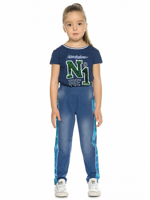Ультрамариновые джеггинсы силуэта бананы - свободный объем сверху и зауженные книзу. Пояс на широкой внутренней резинке, с дополнительной регулировкой шнурком. По переду имитация карманов, вдоль боковых швов лампасы из переливающихся переворачивающихся пайеток.