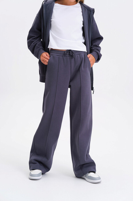 Брюки палаццо для девочки. Актуальные брюки свободного кроя подарят ребёнку комфорт и не будут стеснять движений. Широкая резинка в поясе не давит и не перекручивается. С помощью внутреннего шнура в поясе можно регулировать объём и посадку брюк. По переду застроченные стрелки — модный тренд сезона. По бокам глубокие наклонные карманы. Изделие лаконичного дизайна, без принта. Брюки неприхотливы в уходе. В составе ткани (футер с начёсом) преобладает качественный хлопок — штаны тёплые, мягкие и воздухопроницаемые, дают коже дышать. Благодаря полиэстеру изделие легко стирается, быстро сохнет и сохраняет первоначальную форму в течение долгого времени. Брюки детские выполнены в нескольких универсальных и трендовых цветах — они легко комбинируются с различными футболками, джемперами, толстовками, куртками. Палаццо брюки для девочек дошкольного и младшего школьного возраста, а также девочек-подростков. Брюки широкого кроя подходят для детского сада, прогулок, активного отдыха, спорта, а также для дома. Помните о правильном уходе за изделием: рекомендуется стирать при температуре не выше 30 °C, без предварительного замачивания, с изнанки. Это поможет сохранить качество и цвет брюк на длительное время.