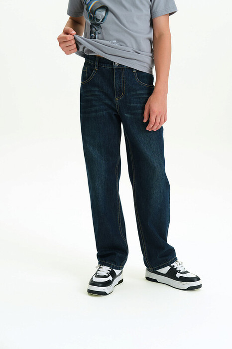 Прямые джинсы для мальчиков выполнены из плотного денима, состоящего из хлопка и 18% полиэстера. Такая ткань обеспечивает прочность и долговечность изделия, а также сохраняет форму после стирок. Модель имеет классический прямой крой, удобные карманы и застежку на молнию и пуговицу. Джинсы подходят для повседневной носки, школы и активного отдыха.