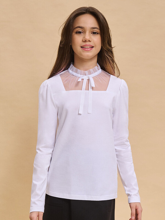 Джемпер с длинным рукавом, со сборкой по окату. Из мягкого хлопкового трикотажа с небольшим содержанием эластана, полуприлегающего силуэта с декоративной вставкой и рюшей по горловине из мягкой тонкой сетки. На горловину настрачивается репсовая лента, имитирующая миниатюрную стойку, на переде которой завязанный бант. По спинке застежка на пуговицу.