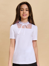 Блузка в школу для девочки. Комфортная и мягкая трикотажная блузка полуприлегающего силуэта подходит девочкам с разной фигурой и не стесняет движений ребёнка. Блузка детская украшена оригинальной декоративной вставкой из мягкой тонкой сетки с рюшем по горловине. Горловина дополнена лентой, с её помощью имитируется невысокий воротник-стойка с бантом спереди. Застёжка на пуговицу расположена сзади. В составе ткани преобладает высококачественный хлопок — ребёнку не жарко, кожа дышит. Благодаря эластану школьная блузка сохраняет форму и первозданный внешний вид в течение длительного времени. Модель однотонная, без принта. В ассортименте представлены блузки для девочек школьные универсальных цветов. Они без проблем сочетаются с различными брюками, юбками, сарафанами. Блузка детская подходит как для повседневной носки в школу, так и для более торжественного случая — в зависимости от того, с чем её надеть. Отличный выбор школьной формы для вашей девочки. Помните о правильном уходе за изделием: рекомендуется стирать при температуре не выше 30 °C, без предварительного замачивания, с изнанки. Это поможет сохранить качество и цвет блузки на долгое время.