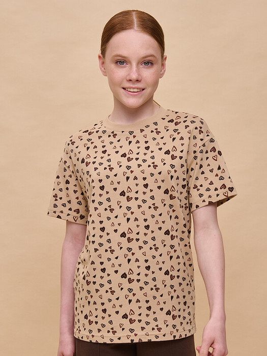 Детская футболка для девочки  небольшого объёма прямого кроя с аккуратным рукавчиком. Вырез горловины обработан эластичной рибаной (ткань в рубчик) — она прекрасно держит форму, не растягивается, при этом ребёнку удобно надевать и снимать футболку. Изделие неприхотливо в уходе. Футболка детская с принтом сплошным в виде сердечек. Принт эластичный и прочный, без проблем переносит частые стирки. В составе ткани 100% хлопка — майка мягкая, воздухопроницаемая, приятная на ощупь. Футболка для девочек выполнена в универсальном цвете, который хорошо сочетается с различными брюками, шортами. Детские футболки с принтом подходят как для маленьких девочек, так и для девочек-подростков. Хлопковая футболка идеальна для любого времени года, её можно носить как летом, так и в холодное время года в качестве среднего слоя одежды. Помните о правильном уходе за изделием: рекомендуется стирать при температуре не выше 30 °C, без предварительного замачивания, с изнанки. Это поможет сохранить качество и цвет футболки на длительное время.