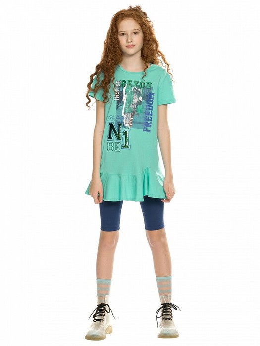 Комплект для девочек  туника и лосины. Туника с фигурной линией низа и притачным воланом. Необычный способ втачивания волана  по переду волан втачивается в разрез, создавая интересные фалды. Силуэт прямой, свободный, с мягкой линией плеча. Фотопринт с разноцветным глиттером и вышивкой переливающимися переворачивающимися пайетками. Перевод  Вдохновляю быть свободной ,  Будь первой ,  Мой стритстайл . Велосипедки длиной до колена.