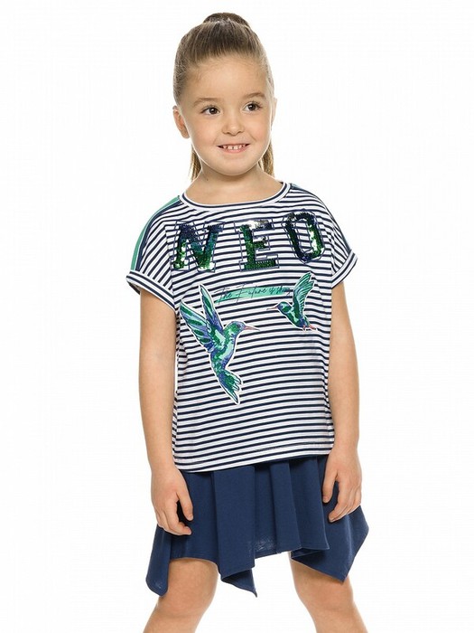Комплект для девочек футболка и юбка. Футболка свободного объёма с цельнокроеным рукавом с отгибающейся закрепленной манжетой. Вдоль линии плеч настрочена декоративная трикотажная тесьма. По переду изделия принт с разноцветным глиттером в виде птичек колибри и надписи, перевод Блестящее будущее , и вышивка из переливающихся переворачивающихся пайеток. Юбка - Новинка. Прямоугольная юбка с фигурной угловатой линией низа, пояс на широкой внутренней резинке.