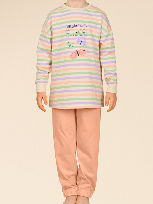 Стильная и уютная пижама в нежных пастельных оттенках для девочки. В составе ткани 100% хлопка — идеально для детской одежды! Модель приятна на ощупь, прекрасно пропускает воздух, позволяя коже ребёнка дышать. При этом в пижаме из хлопка ребёнку будет тепло, даже если он сбросит одеяло. Всё это обеспечивает комфортный и качественный сон. Джемпер и брюки среднего объёма, плечо немного спущено, рукава широкие и свободные — в пижаме очень удобно спать. Широкая и мягкая резинка в поясе не перекручивается и не давит. Манжеты и отделка горловины из эластичной рибаны — она не растягивается, ребёнку удобно надевать и снимать пижаму. Брюки однотонные, персикового цвета. Джемпер в полоску украшает милый принт в виде бабочек. Надписи переводятся: "интересные факты", "бабочки видят в цвете", "они питаются нектаром с цветов", "вкусовые рецепторы у них находятся на лапках". В линейке представлены детские пижамы следующих размеров: 1 (86); 2 (92); 3 (98); 4 (104); 5 (110); 6 (116); 7 (122); 8 (128); 9 (134); 10 (140); 11 (146).  Хлопковый комплект идеален для сна как дома, так и в детском саду — прекрасный выбор для вашего ребёнка! Пижама с брюками подходит для круглогодичного использования. Домашний комплект — замечательный подарок дочке, внучке, сестре на любой праздник. Выбирайте нужный размер по таблице размеров на фото. Цвет товара на экране вашего устройства может отличаться от цвета изделия вживую.