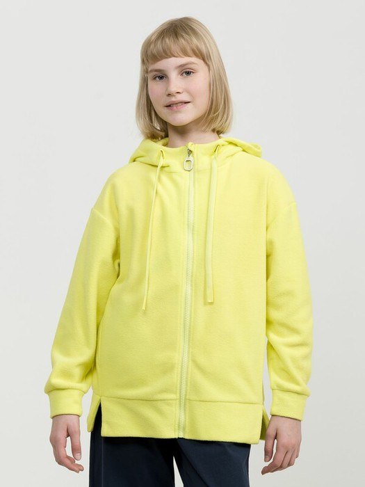 Флисовая крутка увеличенный объем, удлинённая, слегка трапециевидного силуэта, широкий рукав. Боковые швы смещены на полочку, заканчиваются разрезами. Карманы в боковых швах. Объем капюшона регулируется широким шнурком, концы которого обработаны по новому. По низу изделия и рукавов манжеты из основной ткани.