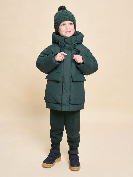 Куртка зимняя для мальчика. Модель прямого силуэта, объем - умеренный оверсайз. Куртка гладкая, без стёжки — суперактуальный тренд сезона. При этом утеплитель простёган внутри изделия — он равномерно распределён и надёжно зафиксирован. На внешнюю поверхность материала нанесена водоотталкивающая пропитка (DWR), она задерживает грязь и влагу снаружи — ребёнок не промокнет от снега, а комбинезон легко отстирается. Также есть дополнительная пропитка на внутренней стороне ткани — для более надёжной защиты от промокания. Капюшон с двумя швами, что обеспечивает анатомически правильную форму и комфортную посадку по голове. Легко одевается на шапку. Высокое забрало капюшона защищает шею и лицо от холода и ветра. Горло закрыто, шарф не нужен. Объём капюшона регулируется эластичным шнуром со стопперами. Центральная застёжка на пластиковую тракторную молнию, разъёмную с двух сторон — удобно садиться, пуллеры металлические, прочные. Сверху планка на велькро (липучках) — быстро застёгивается и расстёгивается. Куртка теплая — центральная молния с изнаночной стороны дополнительно закрыта ветрозащитной планкой. В рукавах внутренние манжеты из эластичной рибаны для защиты от холода и ветра. Рибана приятна на ощупь и при этом надолго сохраняет эластичность, не теряет форму. По переду объёмные накладные карманы с клапанами, закрываются на молнию. Внутренний карман на молнии для важных мелочей. В каждой куртке есть нейм-лейбл! Ребенок не потеряется и не потеряет куртку! В боковых швах и на спинке расположены светоотражающие элементы — безопасность в тёмное время суток. Модель без принта. Зимняя куртка с наполнителем из полиэстера — она тёплая, лёгкая, без проблем стирается, быстро сохнет, сохраняет отличную форму и цвет надолго. Мягкая флисовая подкладка добавляет дополнительную теплоту изделию во время холодов. В рукавах подкладка из гладкого полиэстера для лёгкости надевания. Отличная куртка для мальчика дошкольного и младшего школьного возраста, а также подростка. Идеальный, тёплый и стильный зимний пуховик. Рекомендуемый температурный режим: не ниже минус 30 градусов. Утеплитель: экопух. Куртка водоотталкивающая утеплённая подходит для носки в детский сад, школу, для прогулок и активного зимнего отдыха, игр на воздухе. Помните о правильном уходе за изделием: рекомендуется стирать при температуре не выше 30 °C, без предварительного замачивания, с изнанки. Это поможет сохранить качество и цвет куртки на длительное время.