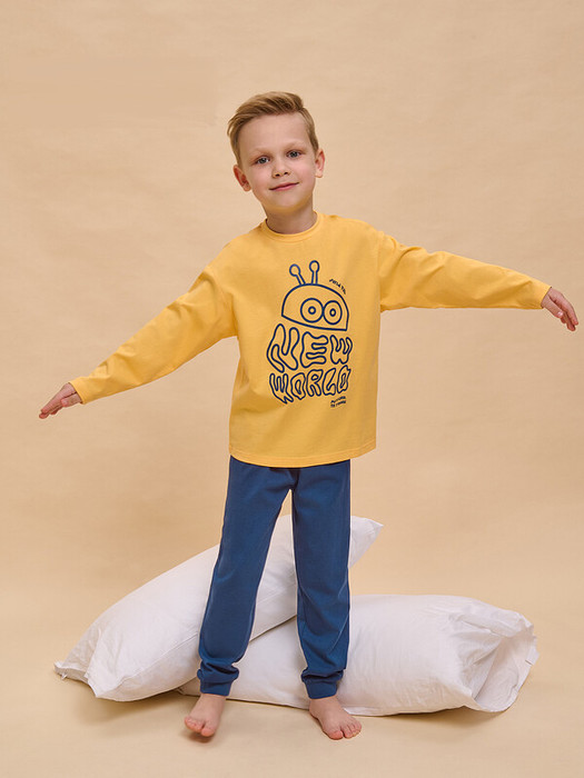 Пижама детская для мальчика. Натуральный состав ткани (100% хлопка) обеспечивает изделию мягкость, гипоаллергенность и воздухопроницаемость. Благодаря этому сон комфортный и качественный. В пижаме из хлопка ребёнку будет тепло, даже если он сбросит одеяло. Джемпер и брюки умеренного объёма, рукава широкие и свободные — комплект для сна очень удобен. В поясе и по низу брюк мягкая и широкая резинка — не перекручивается и не давит. Отделка горловины джемпера из эластичной рибаны — ребёнку удобно надевать и снимать пижаму. А также рибана сохраняет отличную форму надолго. Хлопковая пижама украшена забавным принтом, надписи переводятся: «найди меня», «новый мир», «будущее за тобой». Фишка модели — принт светится в темноте! Такая особенность непременно понравится любому ребёнку. Детская пижама для мальчика неприхотлива в уходе. Принт эластичный и мягкий, легко переносит частые стирки. Детская пижама с брюками подходит для сна как дома, так и в детском саду — отличный выбор для вашего ребёнка! Помните о правильном уходе за изделием: рекомендуется стирать при температуре не выше 30 °C, без предварительного замачивания, с изнанки. Это поможет сохранить качество и цвет пижамы на длительное время.