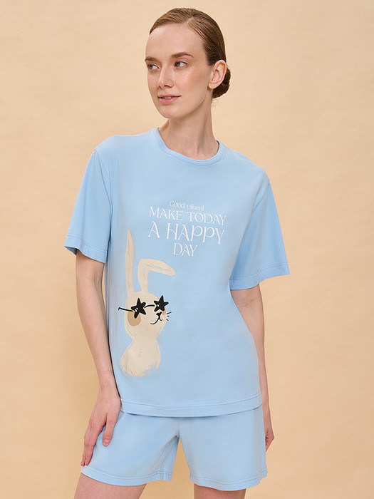 Пижама женская с шортами. В составе ткани преобладает высококачественный хлопок — комплект для сна мягкий, гипоаллергенный и хорошо пропускает воздух. В хлопковой пижаме вам будет комфортно и уютно во время сна. Эластан помогает модели надолго сохранить первоначальную форму. Футболка свободная, плечо спущено, рукава широкие — в пижаме очень удобно спать. В поясе шорт мягкая и широкая резинка — не перекручивается и не давит. Отделка горловины из эластичной рибаны — она не растягивается, пижаму удобно надевать и снимать. Хлопковая пижама украшена милым, «няшным» принтом в виде забавного зайчика в очках, надписи переводятся: «хорошая атмосфера», «сделай сегодняшний день счастливым» — почувствуйте себя беззаботной девчонкой. Пижамный костюм неприхотлив в уходе. Принт эластичный и мягкий, легко переносит частые стирки. Милая пижама подходит как для сна, так и просто для отдыха дома. Помните о правильном уходе за изделием: рекомендуется стирать при температуре не выше 30 °C, без предварительного замачивания, с изнанки. Это поможет сохранить качество и цвет пижамы на длительное время.