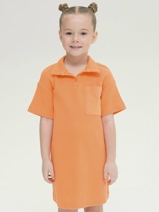 Платье для стильных девочек. Приятный на ощупь, с большим содержанием хлопка в составе, гигроскопичный и простой в уходе вафельный трикотаж. Модель свободного А -образного силуэта с коротким рукавом рубашечного типа, отложным воротником и короткой планкой на одной на пуговице делают платье стильным и отражают актуальный тренд сезона платье под футболку-поло. На груди накладной карман - можно положить мелочь или ключи. Такой фасон не сковывает движения ребенка, благодаря своей простоте и универсальности будет отличным решением для путешествий, прогулок, спорта. А благодаря яркому оранжевому цвету ребёнок не потеряется в толпе.