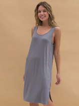Женское платье-майка из эластичной ткани в рубчик. Ткань отлично растягивается и быстро возвращается в исходную форму, приятна на ощупь и проста в уходе. Платье на широких бретелях свободного кроя с увеличенными проймами – стильное, спортивное, комфортное. Боковые разрезы снизу для легкого акцента на ноги. Удобно спать, заниматься повседневными делами и просто быть собой.
