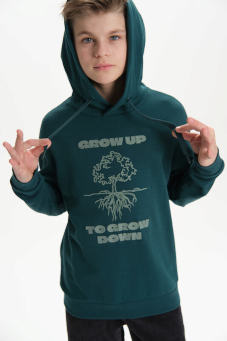Худи для мальчика без начеса – актуальная вещь в любом сезоне, будь то весна, лето или осень. Кофта спортивная для мальчика выполнена из плотного футера-петля, который отлично согревает в прохладную погоду и при этом хорошо пропускает воздух – ребенок активно двигается, играет, не потеет. Толстовка свободного покроя оверсайз со спущенным плечом, углубленной проймой. Рукава а также низ изделия на манжете из рибаны. Кофта без карманов. Капюшон на запахе со шнурками для регулировки. Пайта для мальчика украшена по переду выпуклым резиновым принтом, а также надписью. Перевод принта "grow down to grow up" - расти вниз, чтобы вырасти вверх. Размерный ряд подходит как для малышей так и для подростков.