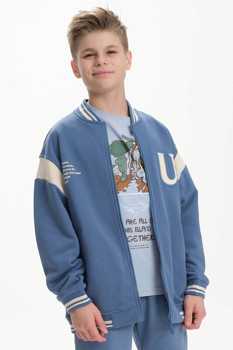 Бомбер для мальчика – трикотажная модель свободного кроя на позднюю весну, лето. Куртка-бомбер выполнена из плотного футера-петля с высоким содержанием хлопка. Воротник, манжеты по рукавам и низу изделия - из декоративной рибаны. На рукавах вставки из основного материала контрастного цвета. Боковые карманы расположены на переде под наклоном. Толстовка для мальчика украшена модным университетским шрифтом с засечками. Перед декорирован нашивкой – объемной мягкой аппликацией из бербер-флиса (барашек) и графичной шрифтовой композицией. Меховая нашивка буквой "U": unity – перевод "единство, командная сплоченность". Надпись: "Be present, listen to music, be with you BF, do things that make you happy #enjoy!" - перевод "Живи в моменте, слушай музыку, встречайся со своим лучшим другом, делай то, что делает тебя счастливым #наслаждайся!". На спине круговая шрифтовая композиция: "Feeling good always trendy" - перевод "Хорошее настроение всегда в тренде (модно)". Бомбер школьный представлен в размерах, которые подойдут как для малышей так и для подростков. Цвет товара на экране вашего устройства может отличаться от цвета изделия вживую.