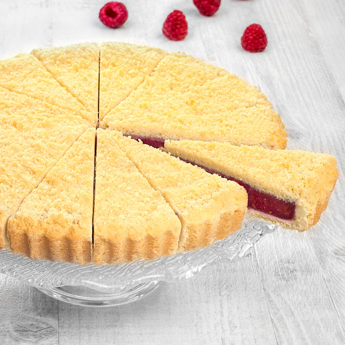 Песочный корж и начинка из спелой малины.