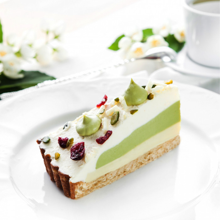 Фисташковый ганаш, крем из зеленого чая матча и воздушные взбитые сливки, на основе из песочного теста.