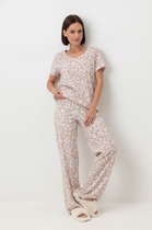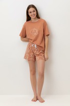 "Костюм-пижама для беременных и кормящих женщин. Футболка с V-образной горловиной, короткими рукавами, со сборкой на резинку спереди, под грудью. Шорты с уменьшенной высотой спереди для их комфортного расположения под животом, расширенные книзу.
