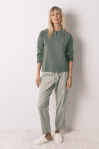 "Костюм-пижама для беременных и кормящих женщин. Футболка с V-образной горловиной, короткими рукавами, со сборкой на резинку спереди, под грудью. Шорты с уменьшенной высотой спереди для их комфортного расположения под животом, расширенные книзу.