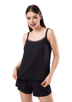 Пижама женская, состотящая из блузы и шорт. Блуза пижамная - из полотна "кулирка" в клетку, свободжного покроя, с короткими цельнокроеными рукавами, V-образной горловиной и центральной бортовой застежкой на обметанные петли и пуговицы. Борта и горловина окантованы основным материалом. Шорты - из полотна "кулирка" в клетку, расклешеные, короткие, с эластичной тесьмой по талии.